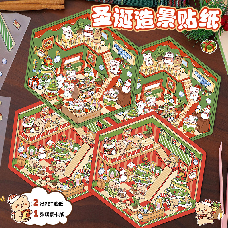 萌えペットシリーズかわいい熊クリスマス造景シール3D手帳素材貼り絵立体視覚解凍ミニチュア場