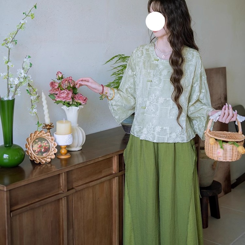 AS499 新中国風ラウンドネックシャツ型紙ワイドレッグパンツスーツ婦人服トップスシャツパンツサンプル