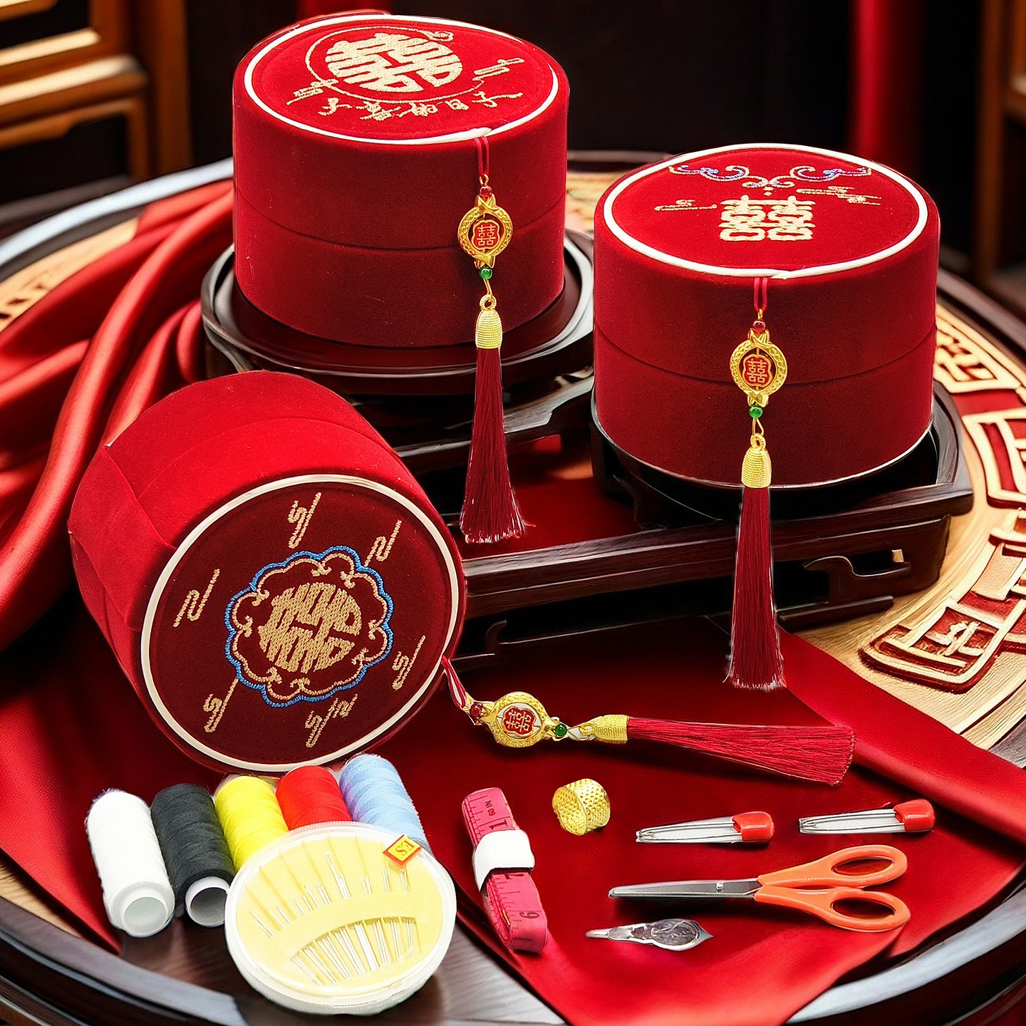 「囍」の吉祥雲模様がプリントされたレトロなウェディング刺繍裁縫箱、絶妙なタッセルペンダント付きウェディングギフトボックス