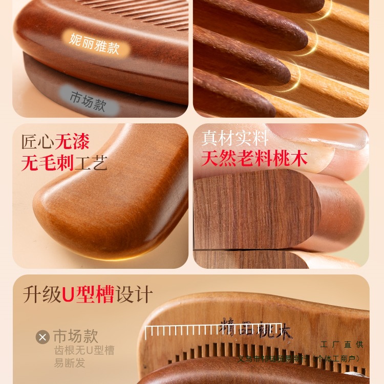 妮丽雅天然桃木梳子男女士静电脱发防长发直发家用檀木梳清洁用品