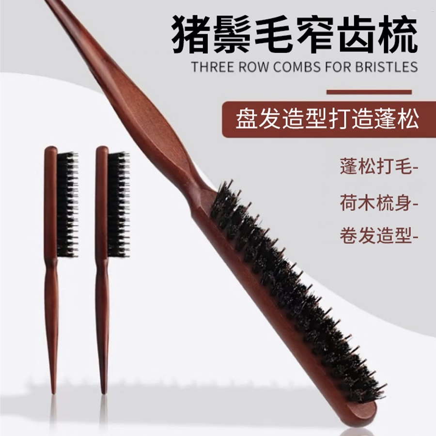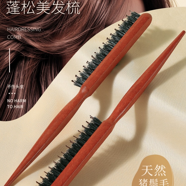 猪毛細歯コーム、理髪用三列毛コーム、ふわふわスタイリング、ロングハンドルメイクアップ、ポインテッドテールヘアカーリング木製コーム