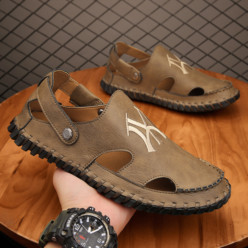 クロスボーダー包頭スリッパメンズアウターウェア本革滑り止め夏の新しい通気性サンダル大きいサイズカジュアルレザーサンダル