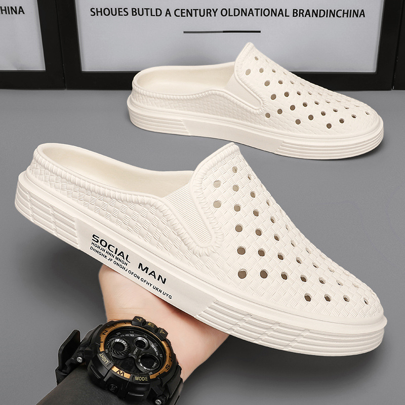2025年秋の新作メッシュ通気性メンズハーフスリッパ、トレンディで多用途なメンズスリッパ、若者向けのつま先付きスリッパ