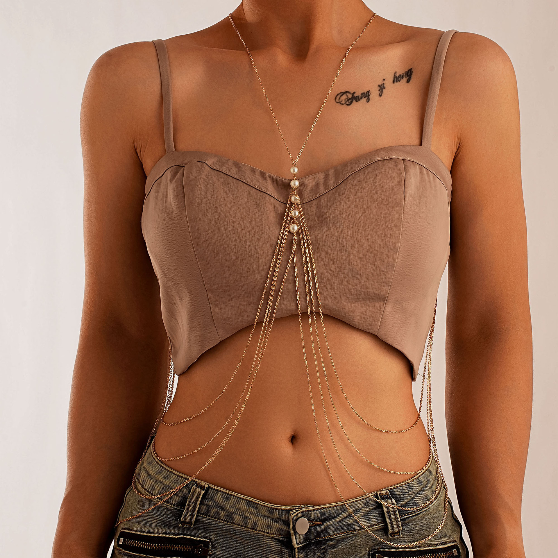 ヨーロッパとアメリカのクロスボーダーセクシーなホットガールボディチェーンウエストチェーンレディースファッションショーフェイクパールショルダーチェーン胸チェーン衣類チェーン