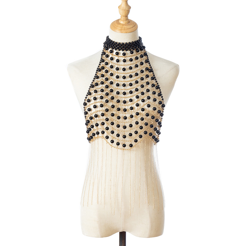 ヨーロッパとアメリカのセクシーなリゾートスタイルのパールネットタッセルホット販売チェストチェーン誇張された個性レトロヘビーデューティボディチェーン台形