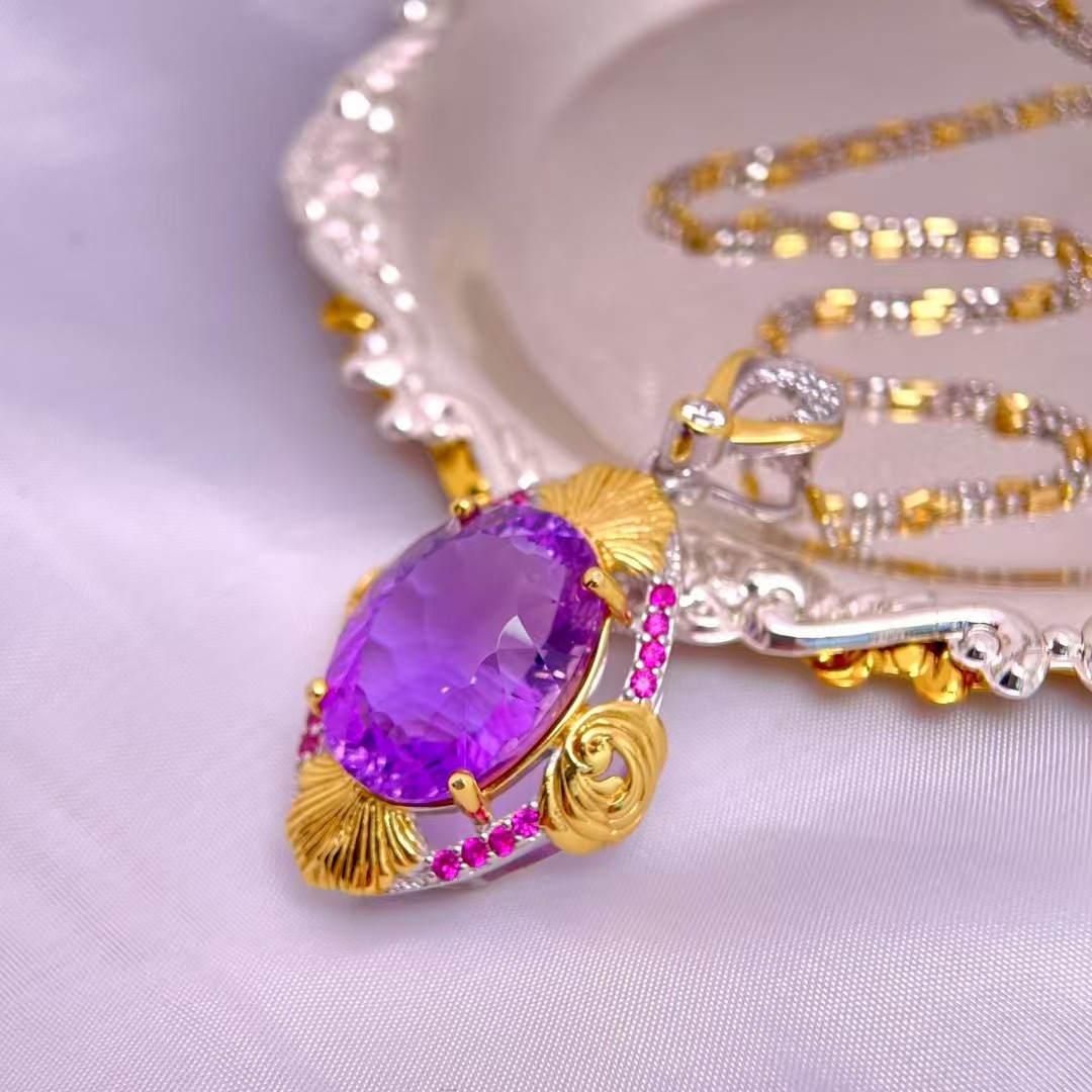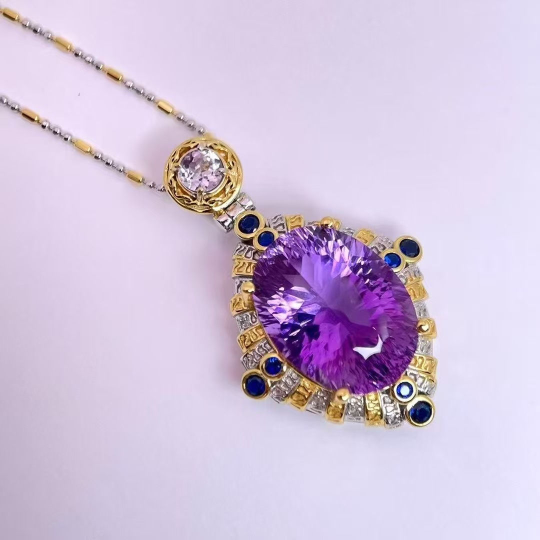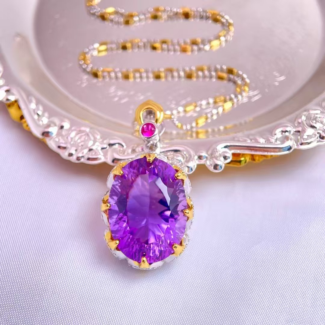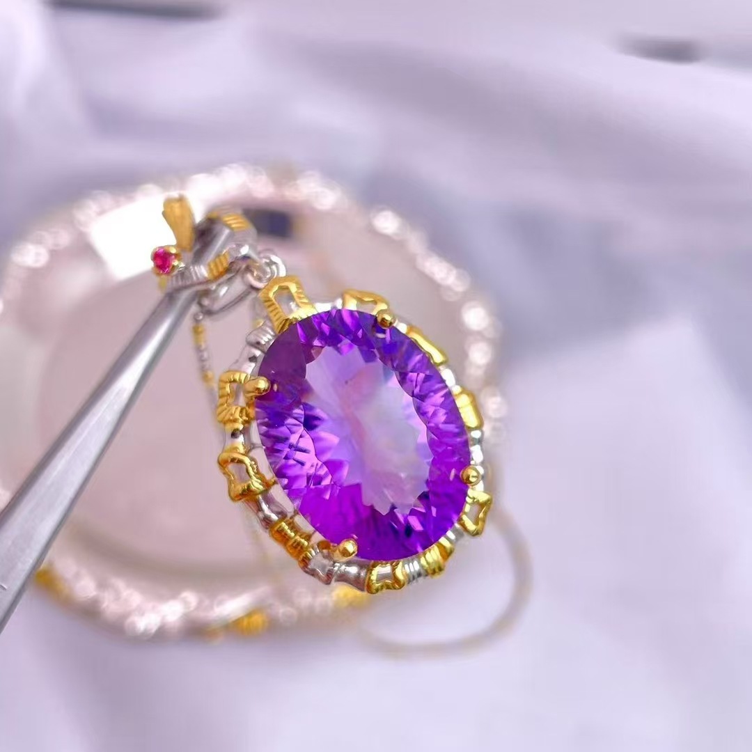 イタリア ブラジル 天然アメジスト ペンダント ダブルカラー クラフト バロック シルバー925 レディース