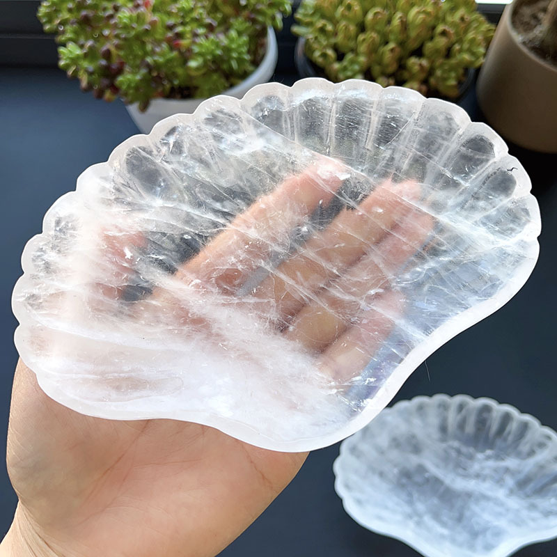 天然の白い水晶の貝殻の碗の白い水晶の原石は水晶の碗の貝殻の形を磨きます。