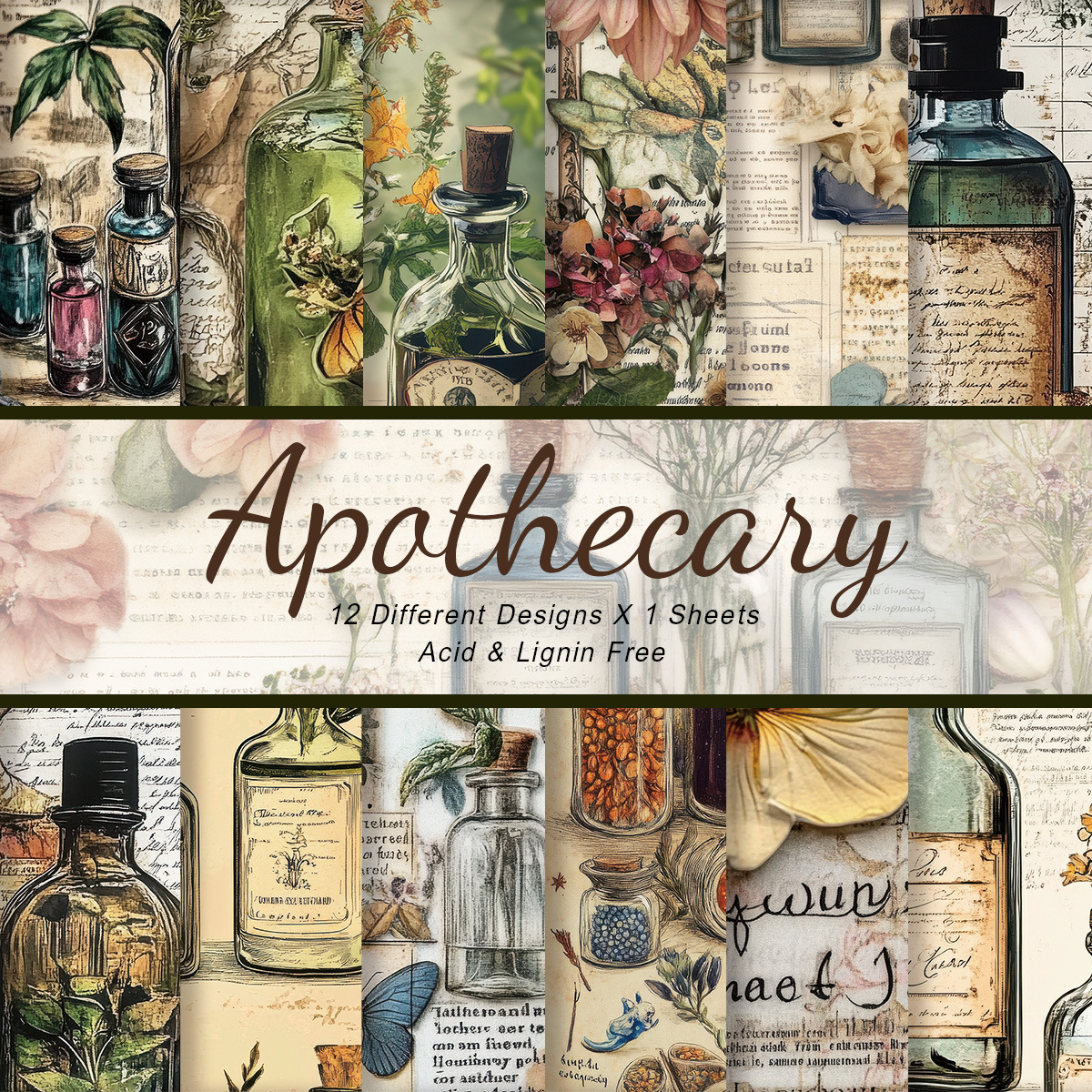 レトロなハーブ実験ノート素材紙12枚、薬剤師ツール、装飾模様、背景紙、スクラップブックコラージュ