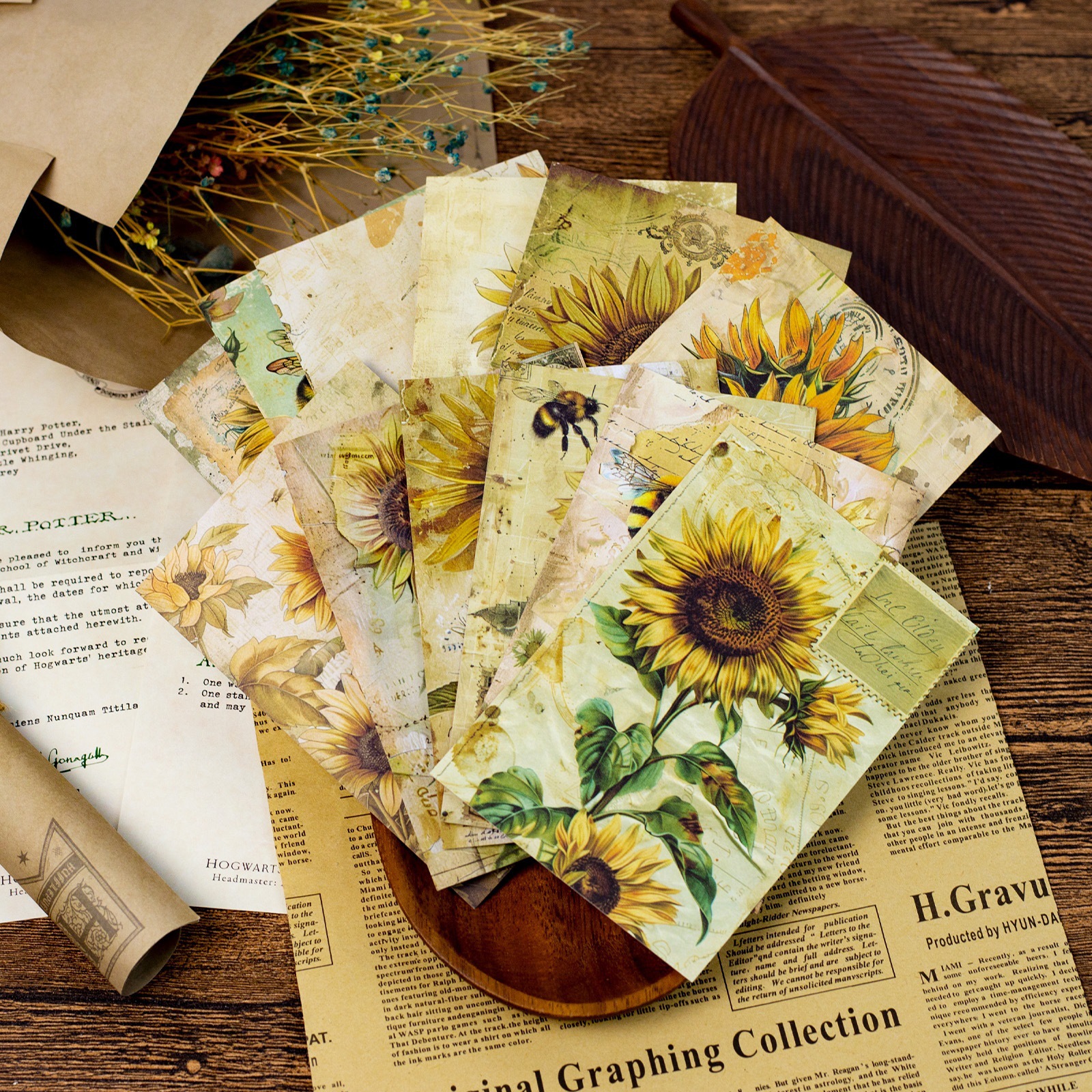 ひまわりの花をテーマにした素材紙12枚、レトロでロマンチックな植物模様、暖色系の文学的で芸術的なハンドブックの背景紙