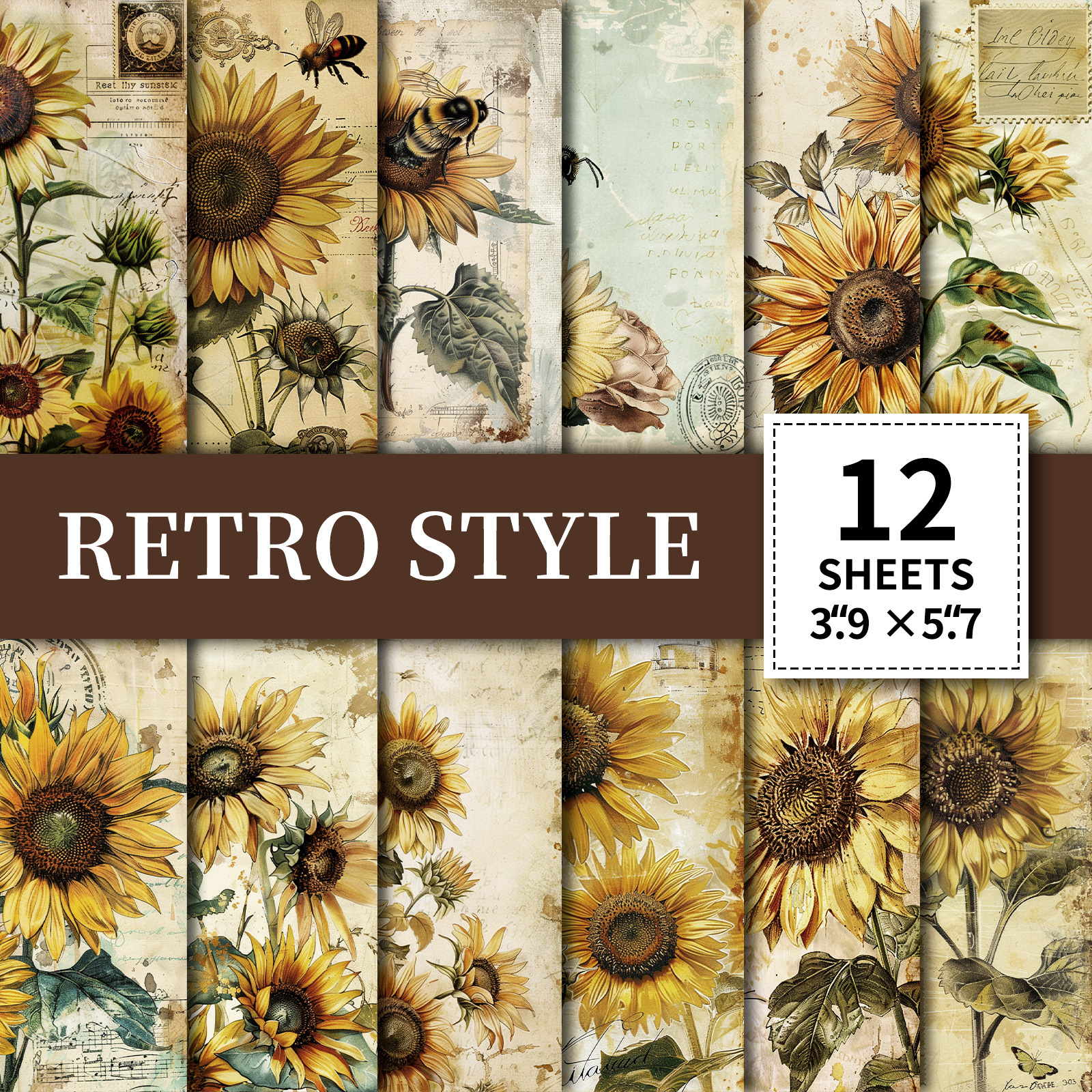 12枚油絵ひまわり手帳素材紙新品レトロ手帳風景素材盛り合わせ写真バックパック