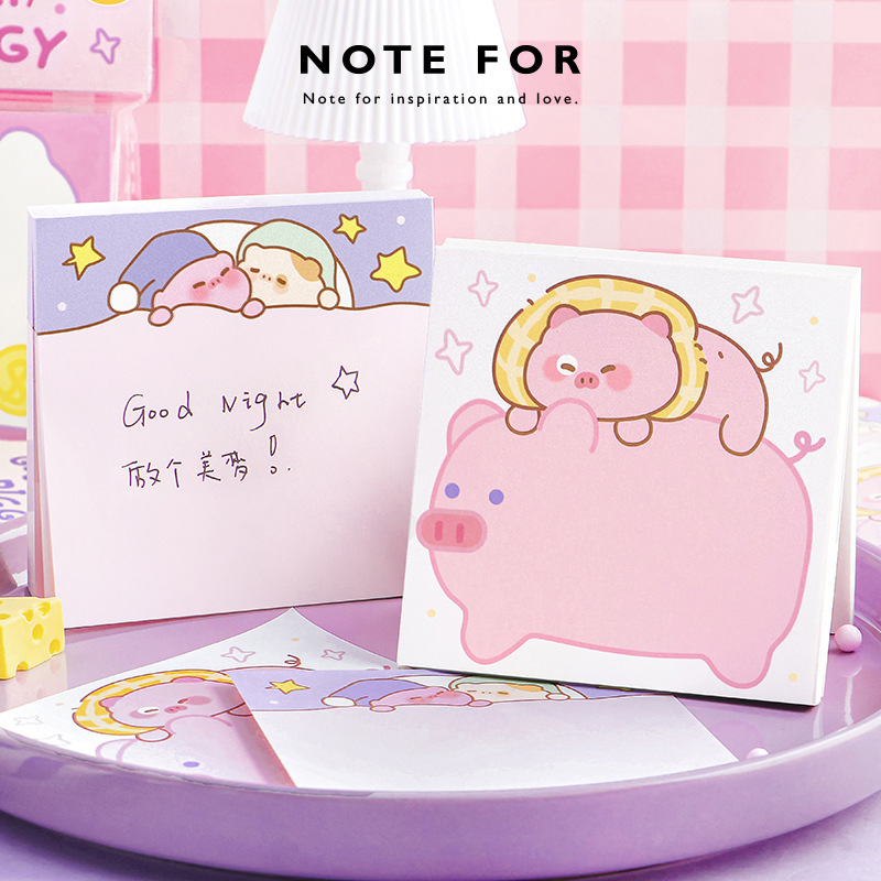 NOTE FOR 100枚の付箋の子豚がどんどん来て、かわいい動物のメモリストのメッセージ紙を持ってきた