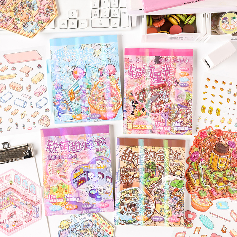 ジルーユエジェン 3D立体ミニチュア造園ステッカーブック 漫画風立体小屋DIYミニチュアシーンデコレーションステッカー