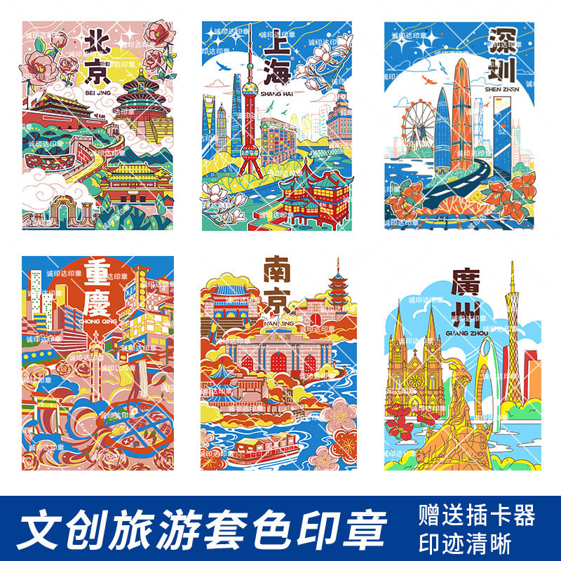 都市観光地区の多色の色のカードの印鑑の重ね色は章の観光スポットの博物館の展示場の文を集めて印刷を作ります。