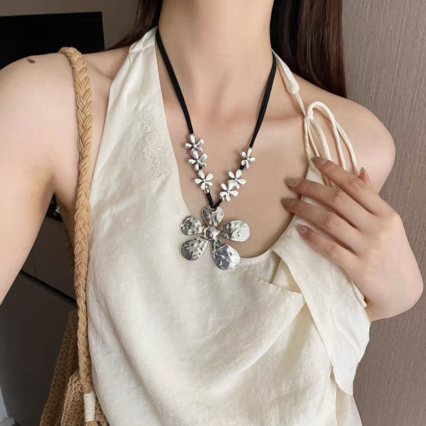 Zha Zha Yo 韓国インスタイル シルバー オールドスタイル 大きな花 小さな花 ネックレス 鎖骨チェーン ニッチデザイン
