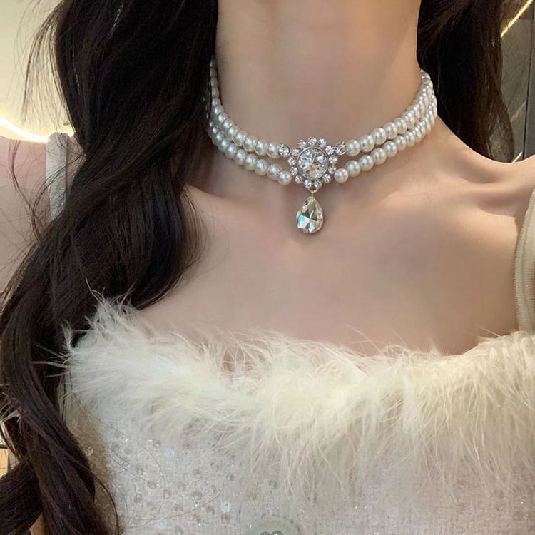 ダイヤモンド水滴二重真珠ネックレス軽豪華小衆レトロ宮廷風鎖insネット赤気質ネックレス