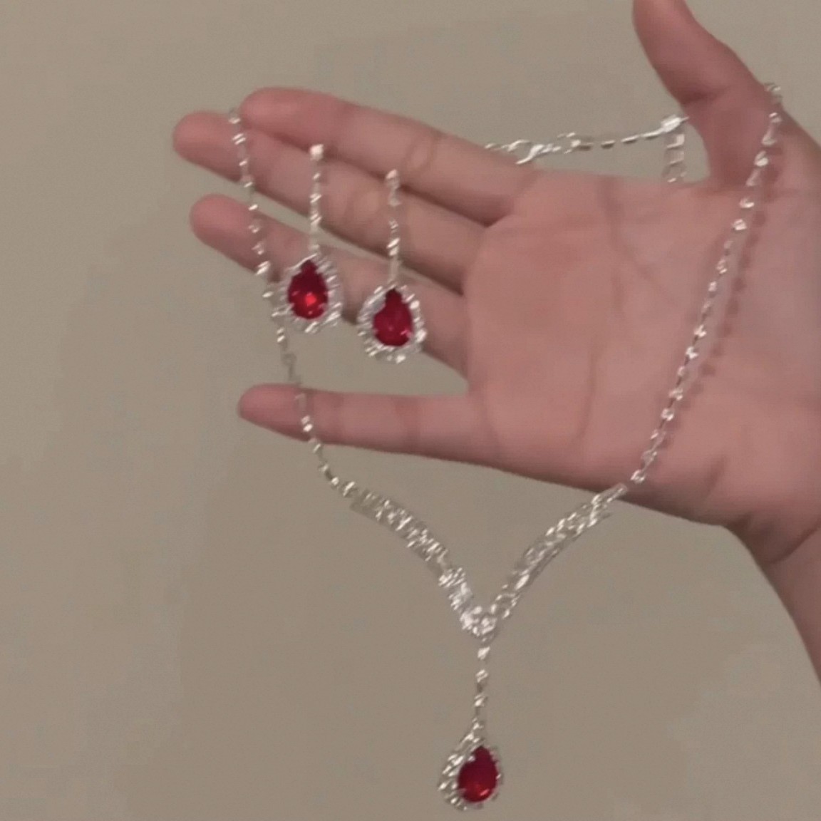 2025新しい赤い水滴ジルコンのネックレスのイヤリングセットの女性の花嫁のセットの夜のドレスのアクセサリーの鎖の潮