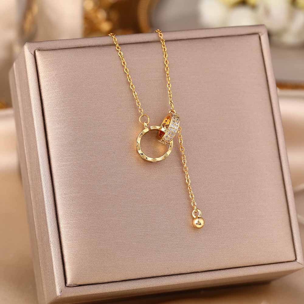 2024年の新型ファッション韓国版双環小金球流蘇ペンダントデザインネックレス夏にチタン鋼ネックレス女が必要
