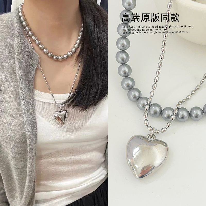 2024年ins韓シンプル大桃心畳は鎖骨鎖金属愛ネックレス女性の銀色長版を装着した