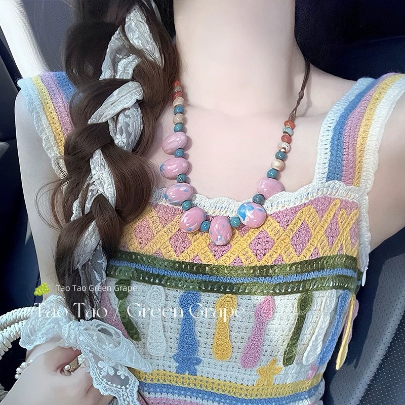 レトロエスニックスタイル夏ドーパミンカラーセラミックビーズネックレスレディースロングスイートクール2025新しいネックレス