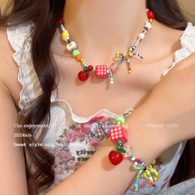 Apple Paradise~カラフルなドーパミンビーズリボンネックレスレディースキュートでスイートなニッチデザイン鎖骨チェーン