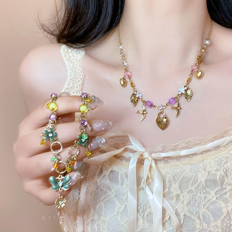 中古ヴィンテージラブバタフライフラワーネックレスレディース2025新レトロ鎖骨チェーンハイエンドネックレス