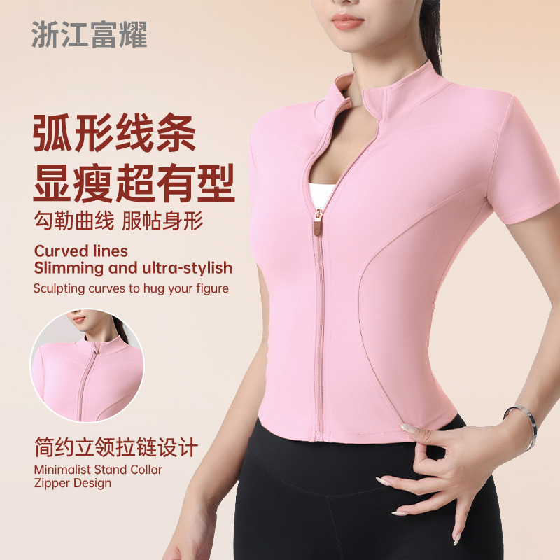 富耀高弾性ヨガ半袖ジャケット ピンク スタンドカラー タイトフィット スポーツジャケット 裸感フィットネス半袖 レディース