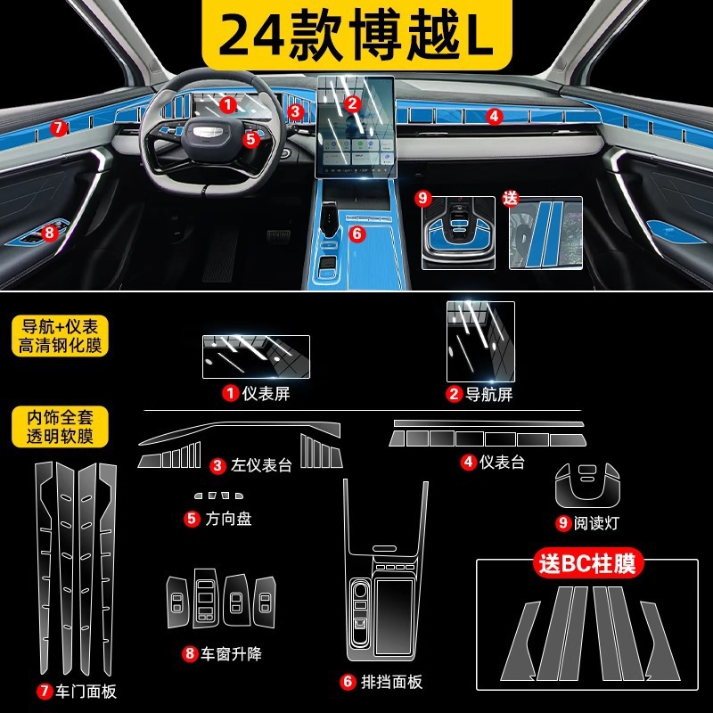 吉利博岳Lインテリアフィルム、中央制御フィルム、強化保護フィルム、車内装飾用品の24種類に適しています。