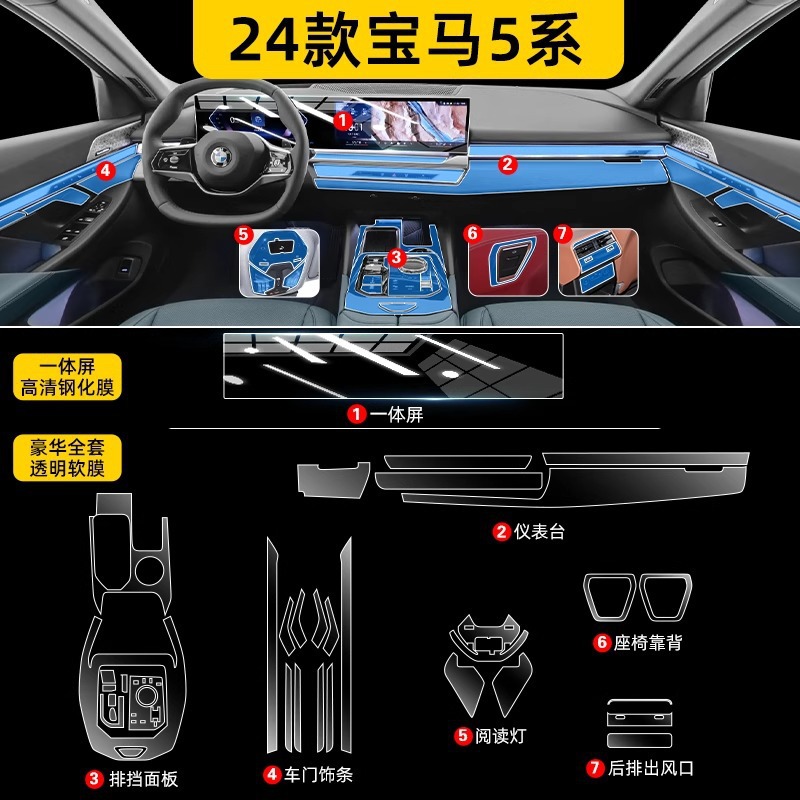 24種類の新M5インテリア保護、中央制御フィルム、ナビゲーション画面強化フィルム、新車インテリア用品に適しています。