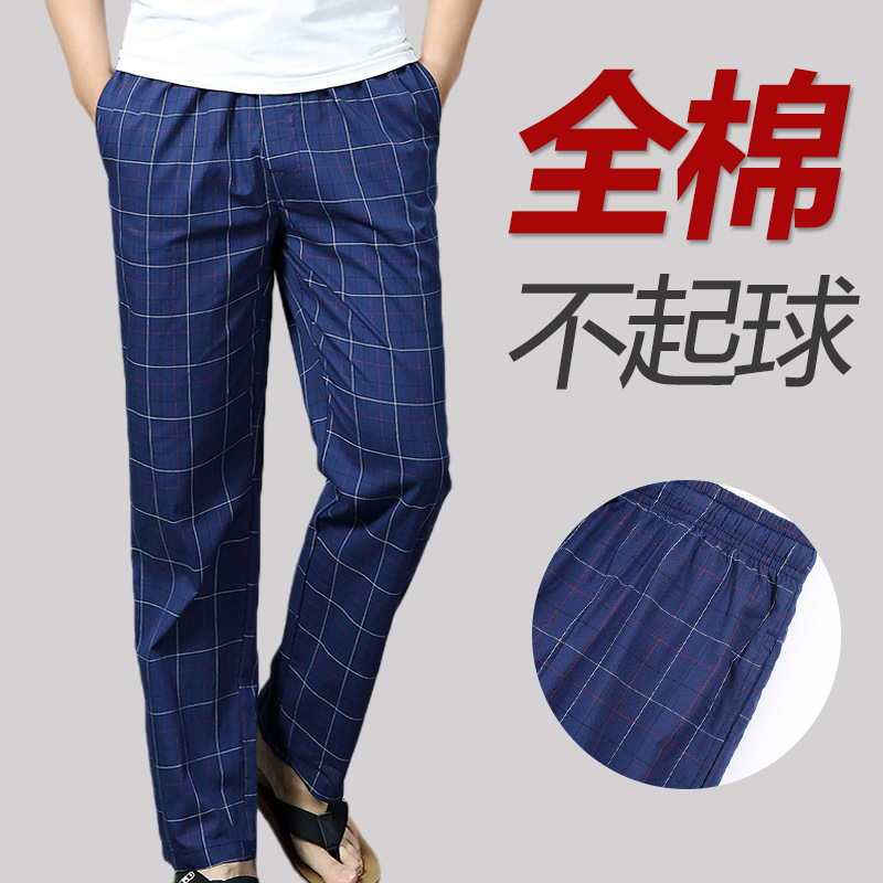 純綿の寝ズボンの男性の春と秋の大きいサイズのズボンの薄い綿の弾力の家のズボンは外に格子のZHYを着ることができます。