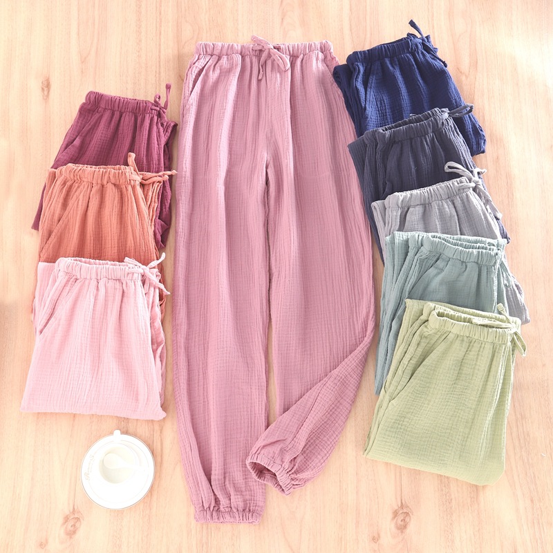 春夏カップルの薄い綿二重ガーゼの睡眠ズボンの女性の口のちりめんのズボンの綿の家庭の男性の純色のポケット
