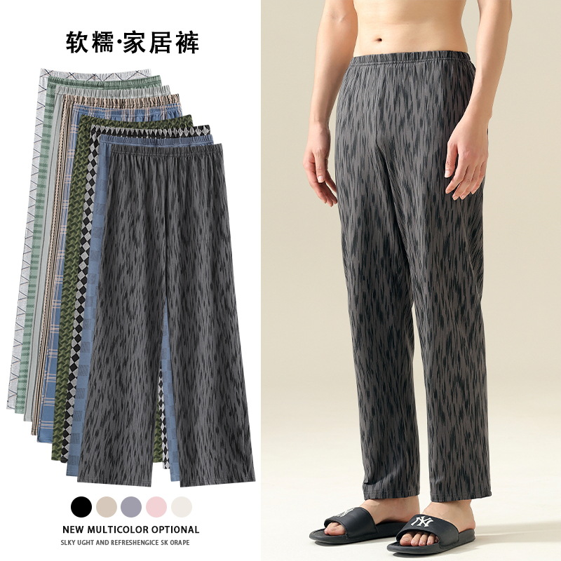 夏薄いパジャマアイスシルクメンズプラスサイズルーズカジュアルティーンエイジャーは外で着用できます無地ストライプホームパンツ