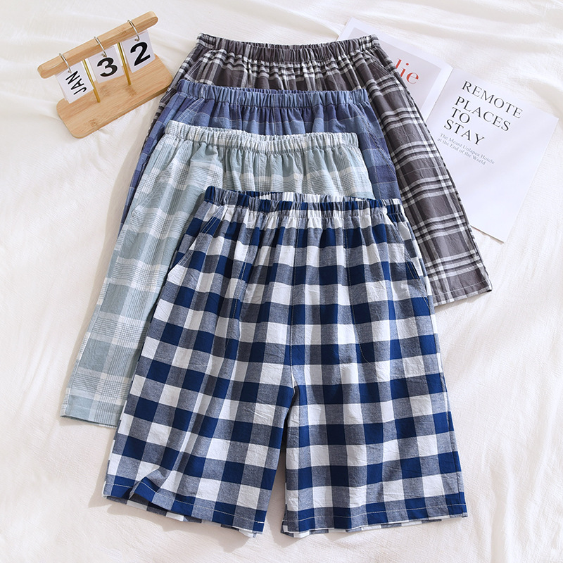 洗濯綿の夏の半ズボンの男性の薄いタイプの布帛の綿の5分のズボンのガーゼのビーチのズボンは外に日本の格子のパジャマのズボンを着ることができます。