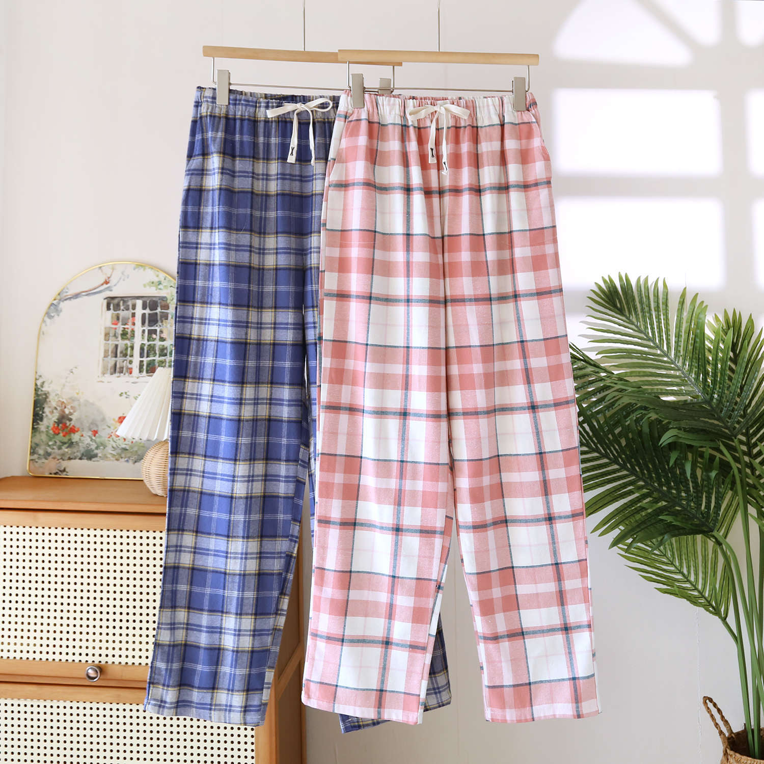 カップルのパジャマの女性のズボンのガーゼの夏の薄いタイプの日系の格子のゆったりした家の新型の四季の家庭のズボンの男性