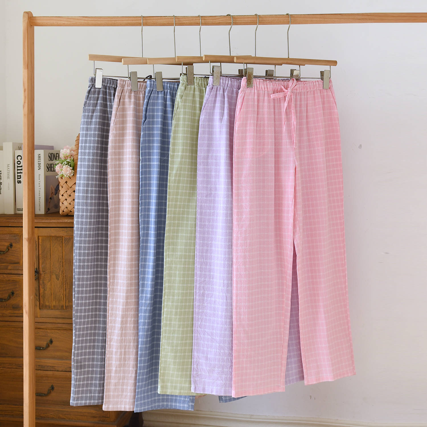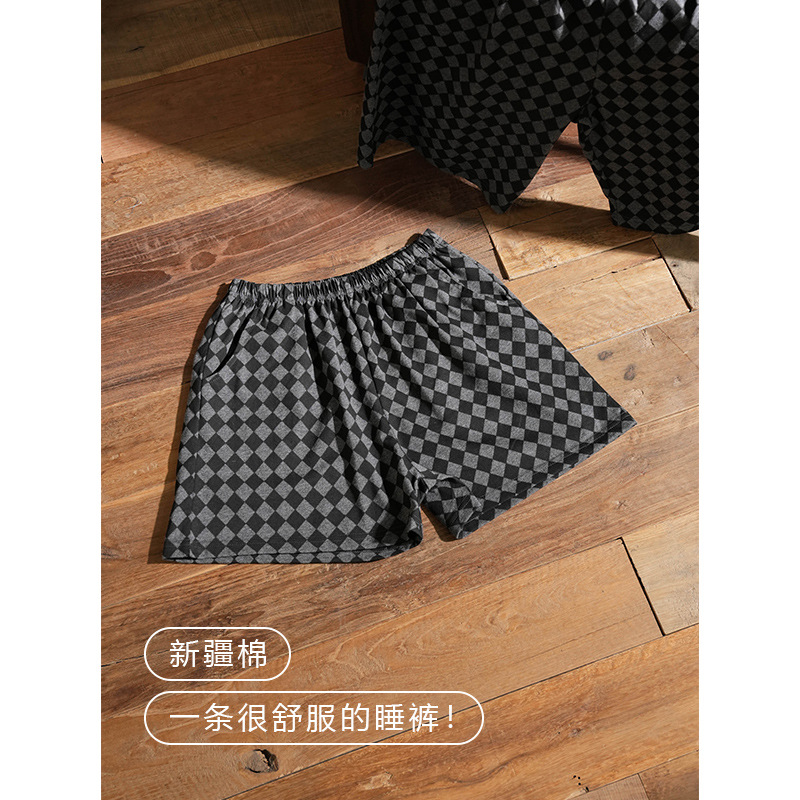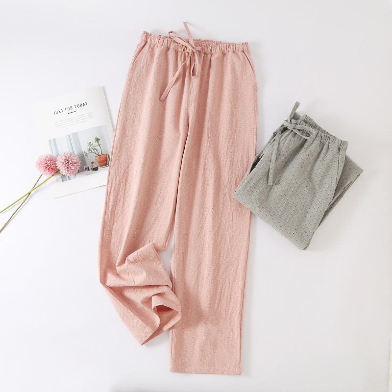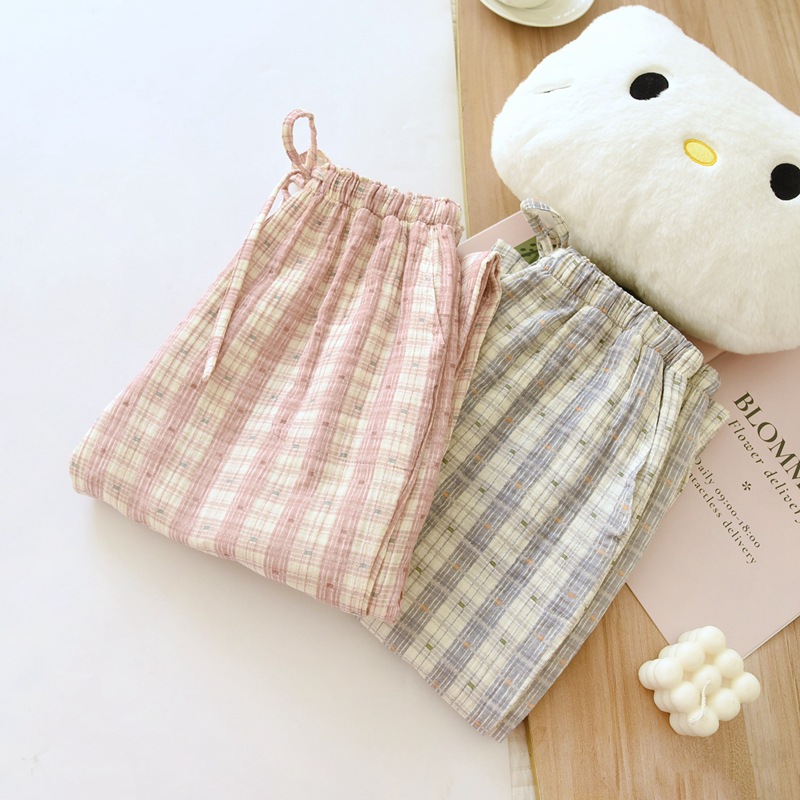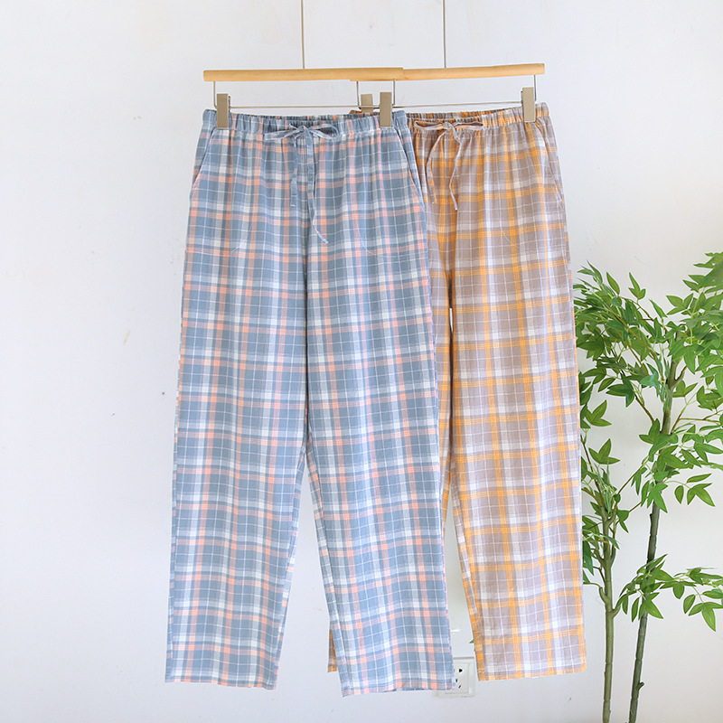 日系格子カップル純綿寝ズボン春夏秋薄手水洗い綿ポケット家庭長ズボン