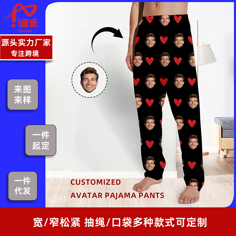 クロスボーダーデジタルプリントメンズ春と秋のパジャマカスタムポリエステル模造綿巾着ポケット付きホームパンツメーカー加工