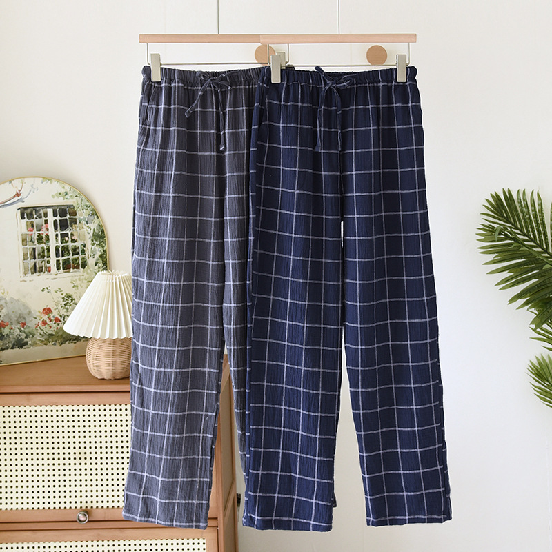 日本の格子の男性のガーゼの四季の綿の睡眠のズボンの春と秋のゆったりしている薄いサイズのカジュアルなズボンの家のズボン