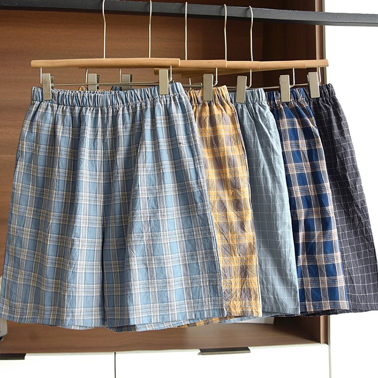 夏の新型男性パンツ色織単層ガーゼ五分ズボン格子風シンプルカジュアル家庭用ズボンビーチパンツ