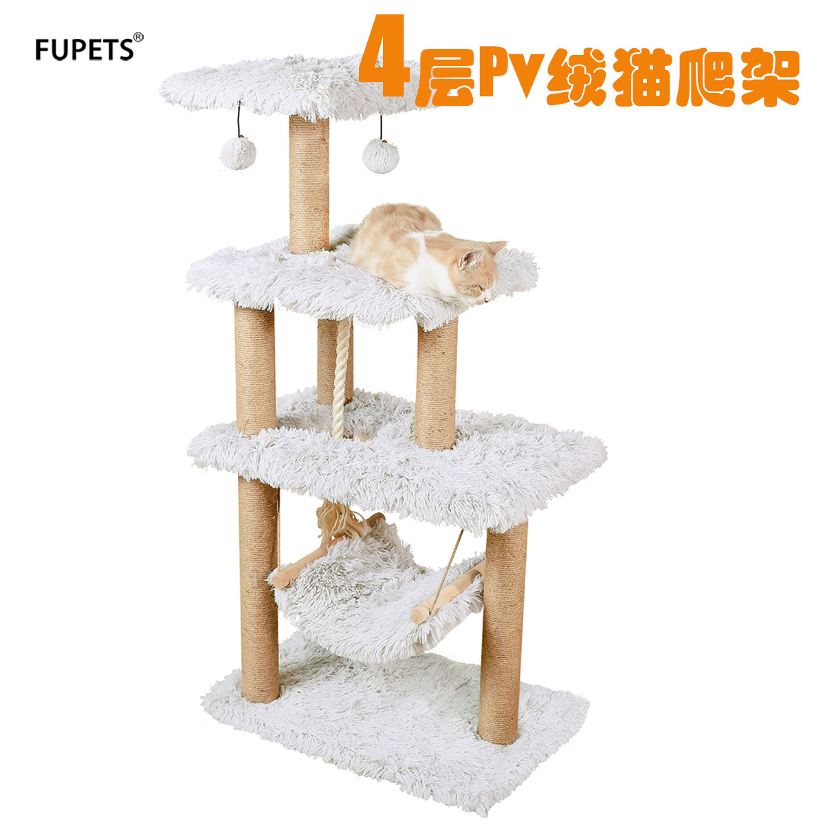 4層多機能PVベルベット猫クライミングフレームジュート猫スクラッチ柱猫ベルおもちゃボール無垢材ハンモックサイザル麻クライミング