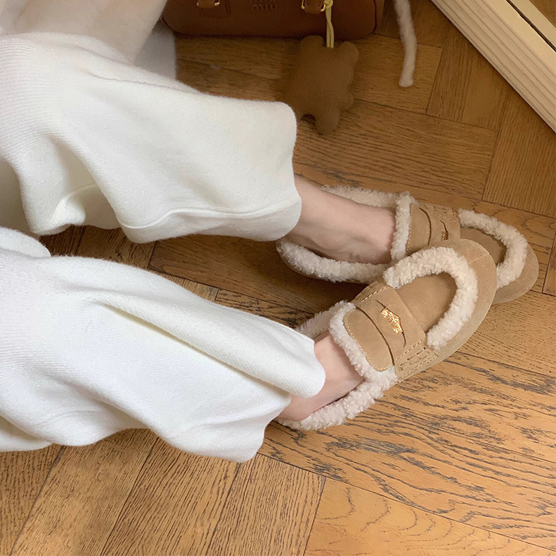 在庫あり~min家本革ラムウールローファー レディース 冬用 裏起毛 暖かい フラットシューズ ゴールドコイン モコモコシューズ シングルシューズ