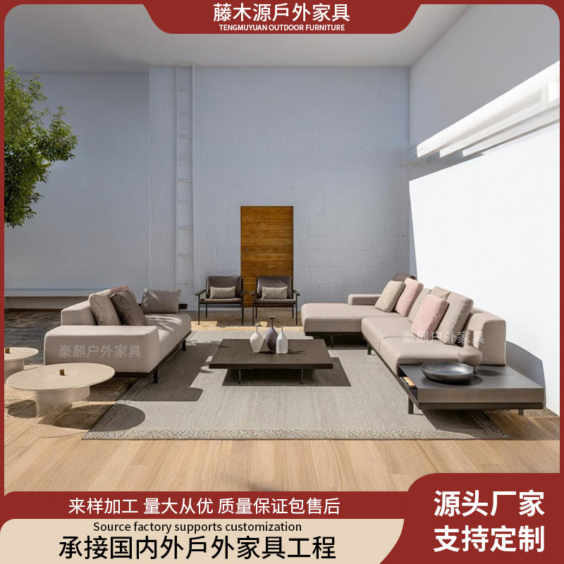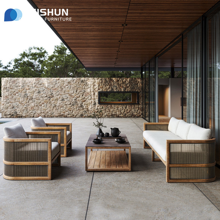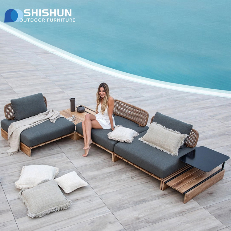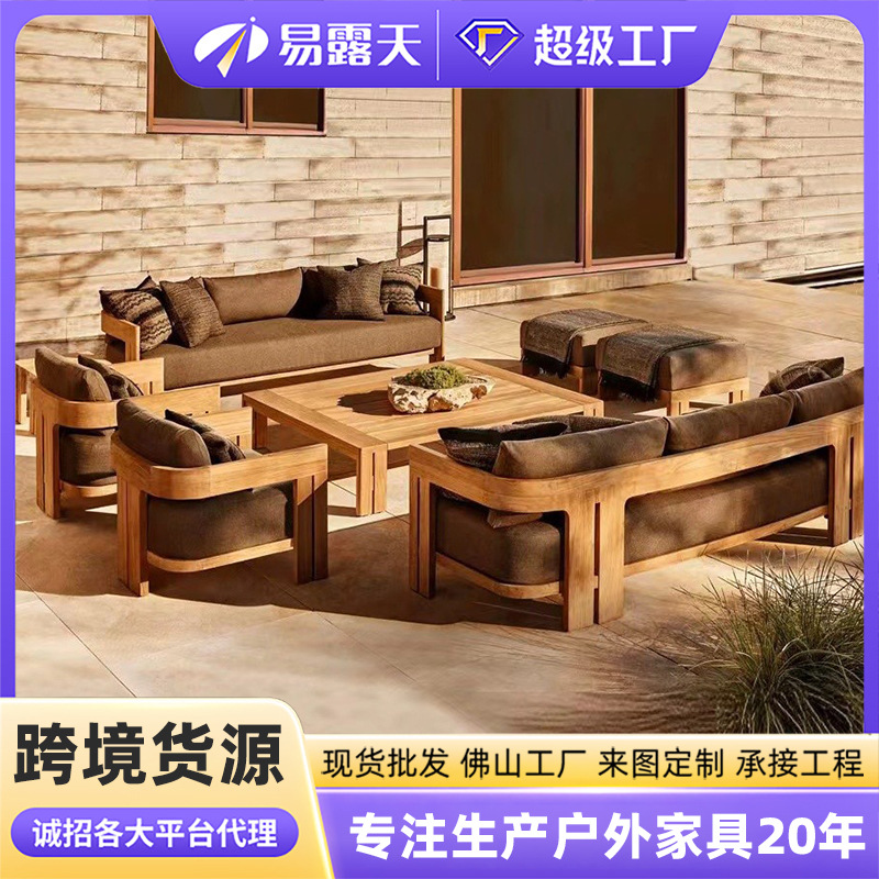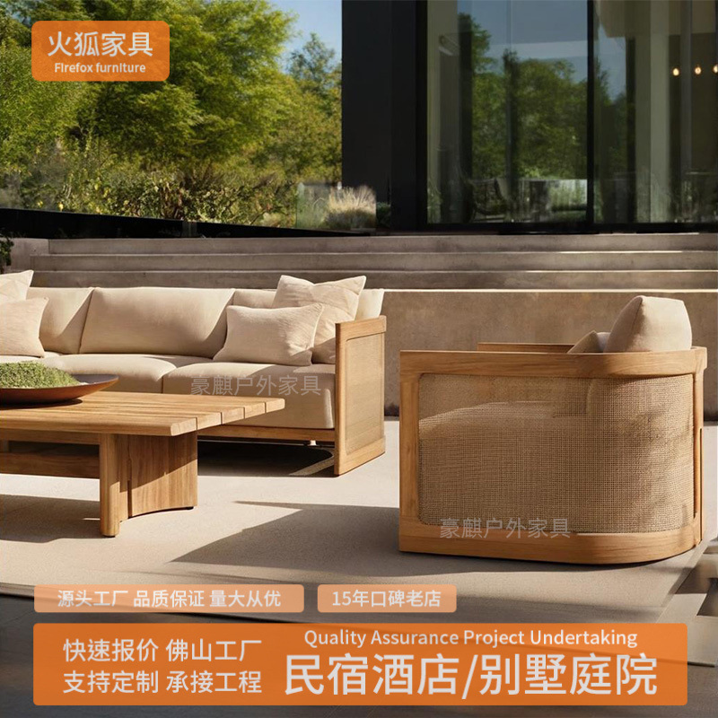シンプルな屋外無垢材ソファコンビネーションヴィラホテルハイエンドオープンエアソファ中庭ガーデン防水チーク家具