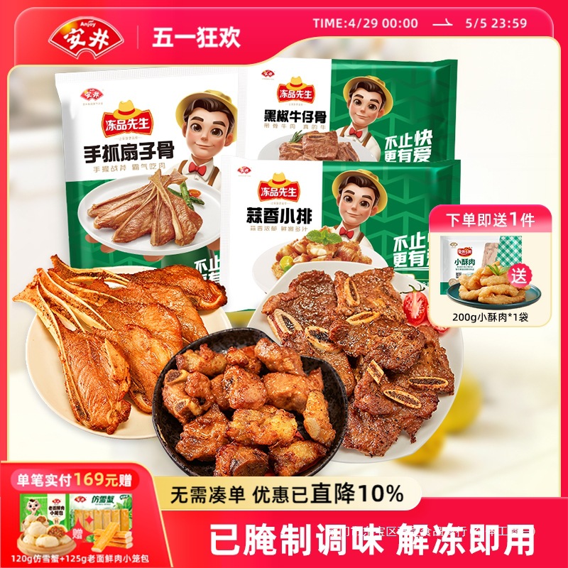 安京冷凍ミスターバーベキューのマリネ食材、肉、ガーリックカルビ、ファンボーン、カウボーイボーン、既製半製品