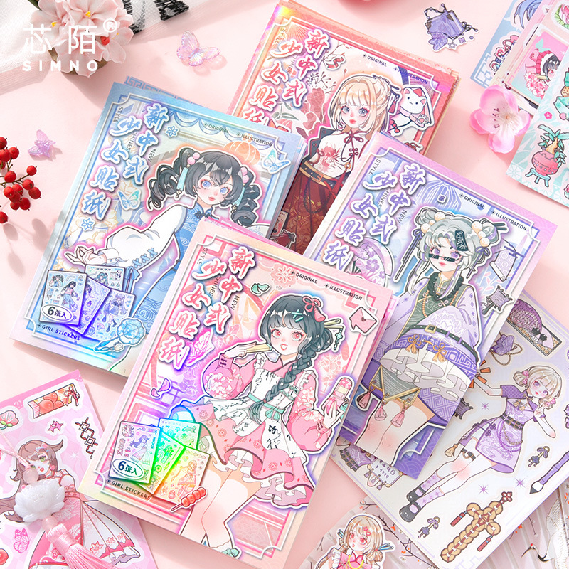芯の見知らぬ人の少女はシールの新しい中国風の風景を飾って紙の本のかわいい古風の漢服の小さい女の子を貼って紙の本を貼ります。