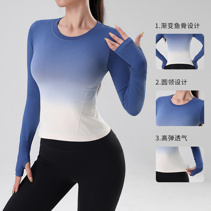 新商品の国境を越えたヨガグラデーション色速乾運動フィットネス長袖tシャツの女性は上着を身に着けています。