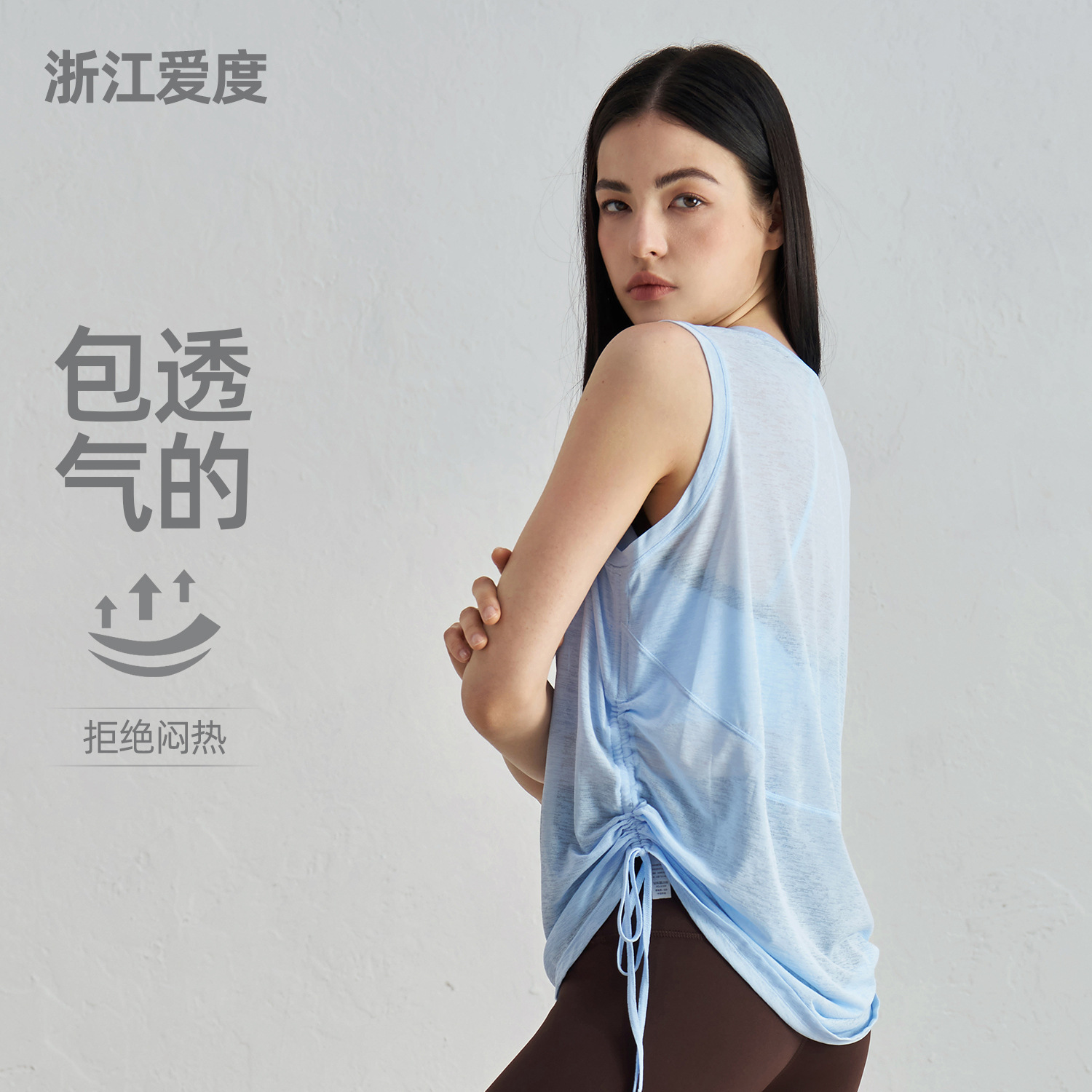 竹節糸夏通気ヨガベスト女性ゆるい丸首袖なし運動上着裾引き紐ヨガブラウス