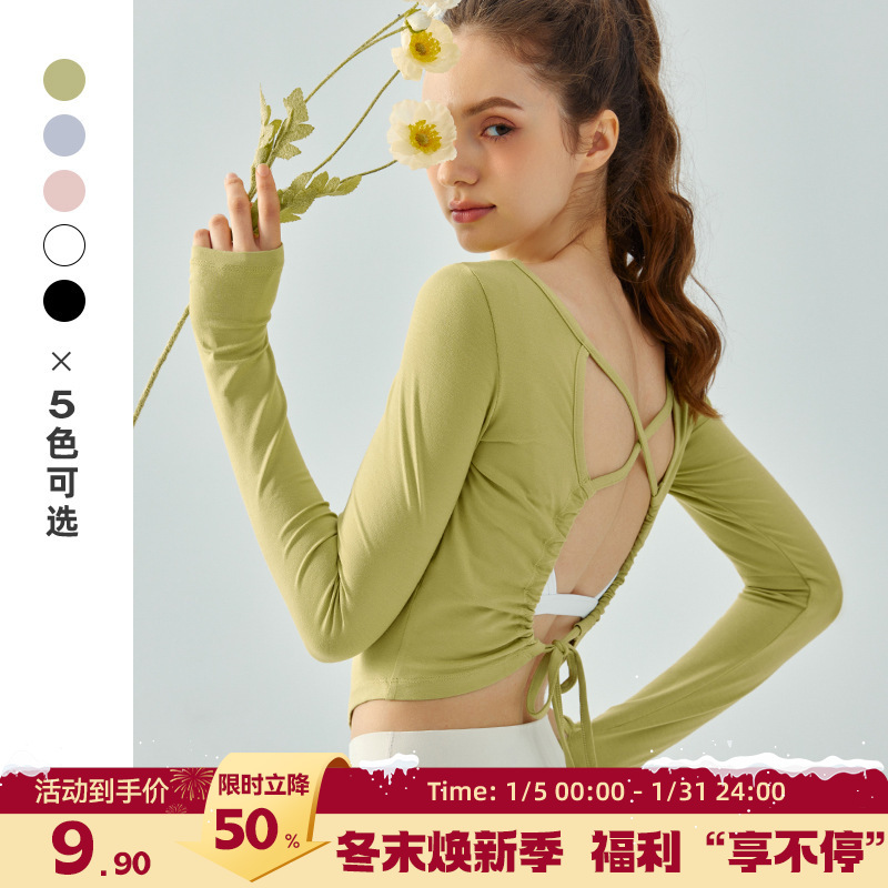 薄いヨガカバーアップ長袖ヒップカバー女性のプリーツ巾着Tシャツルーズカジュアル春夏フィットネスヨガウェア