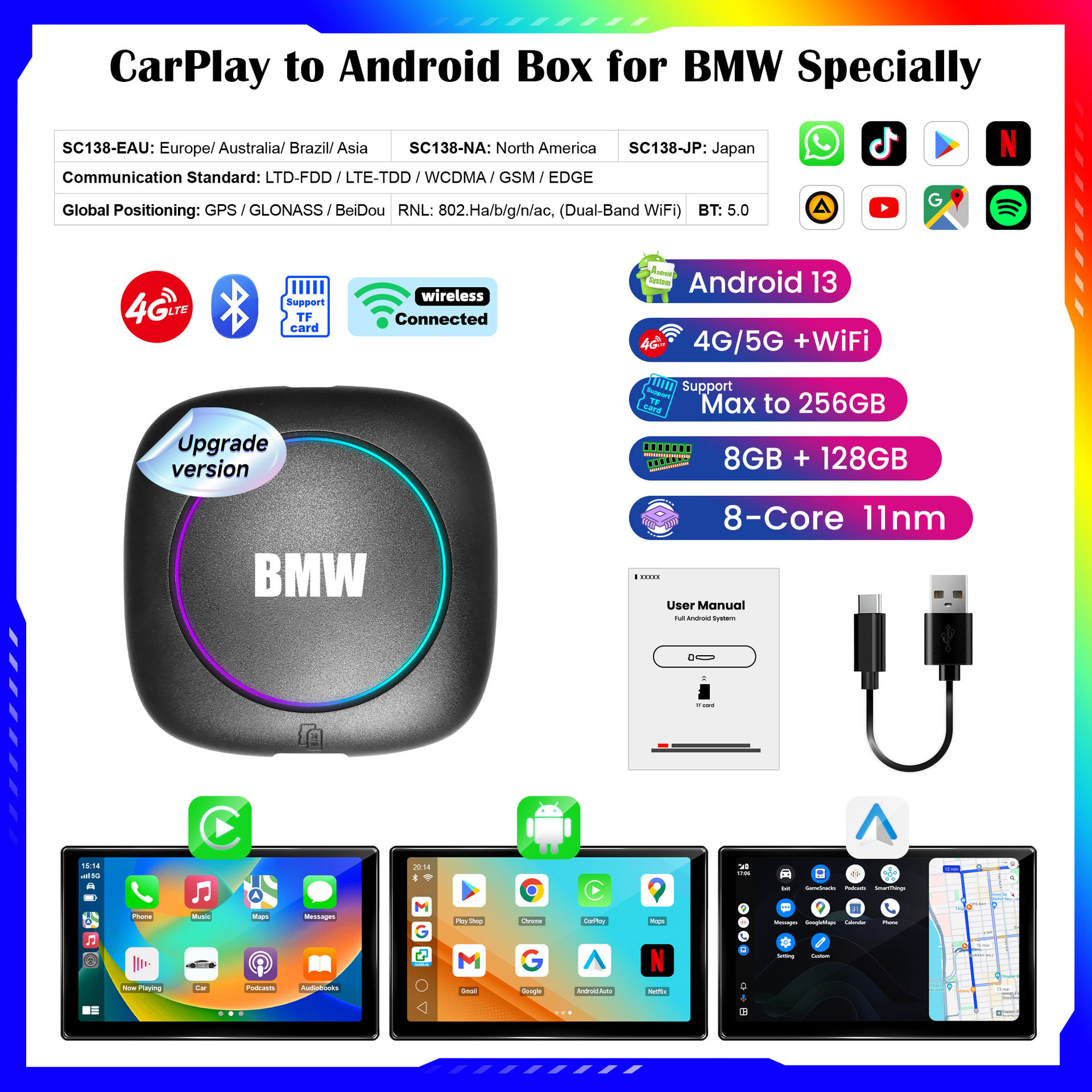 8コア 8+128G ワイヤレス Android 13CarPlay と AndroidAuto Android スマート AI ボックス