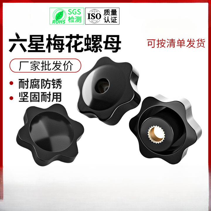 スルー穴梅花ハンドルナット六星ハンドル胶木手ねじりつまみブラインド穴銅芯ねじキャップ4m5m6m8m10