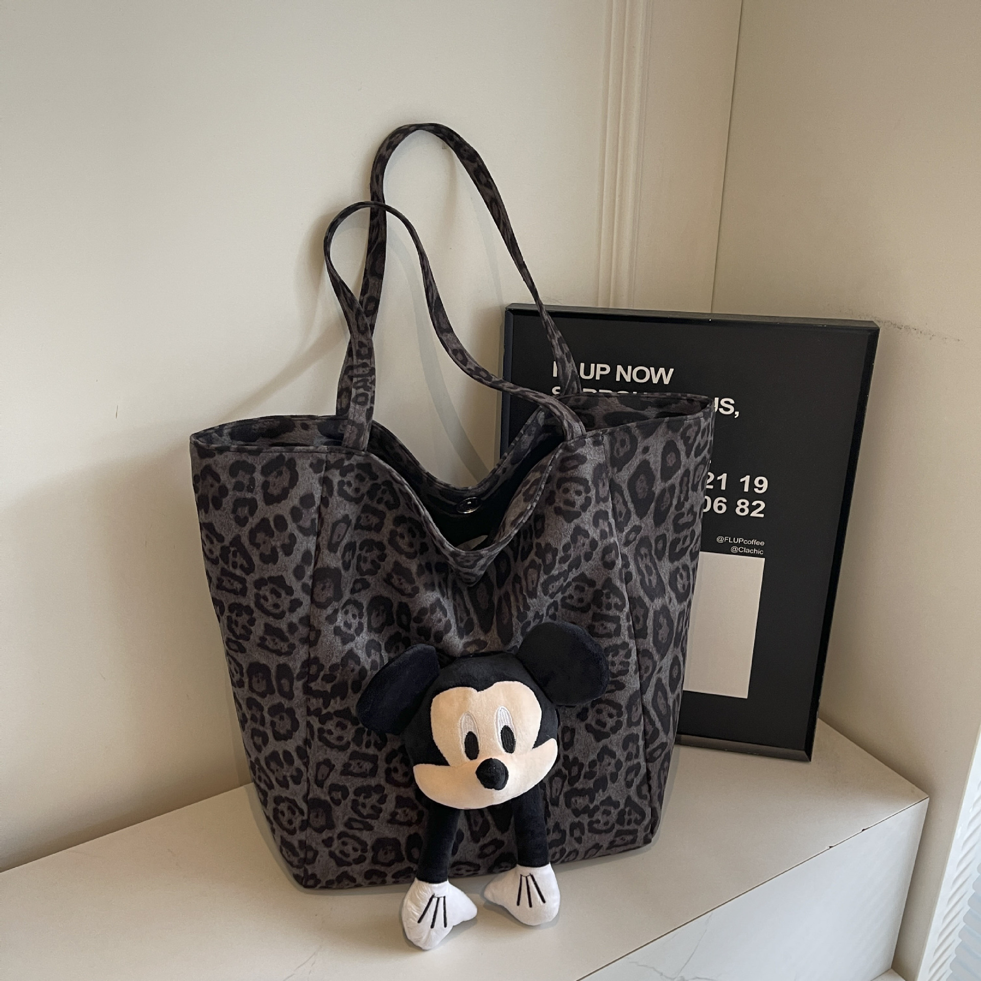 国境を越えた新作ミッキーマウス人形ショルダーバッグ、大容量ヒョウ柄漫画ハンドバッグ、女性向けおしゃれ通勤トートバッグ