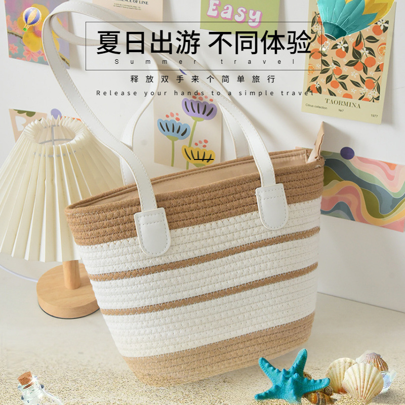 インス風コットンロープ編みレディースバッグ、軽量高級感、アーティスティック、大容量、通勤トートバッグ、Hバックル、シングルショルダー、休暇、ビーチバッグ