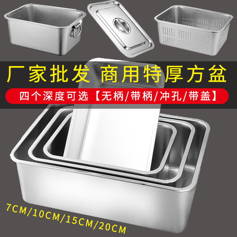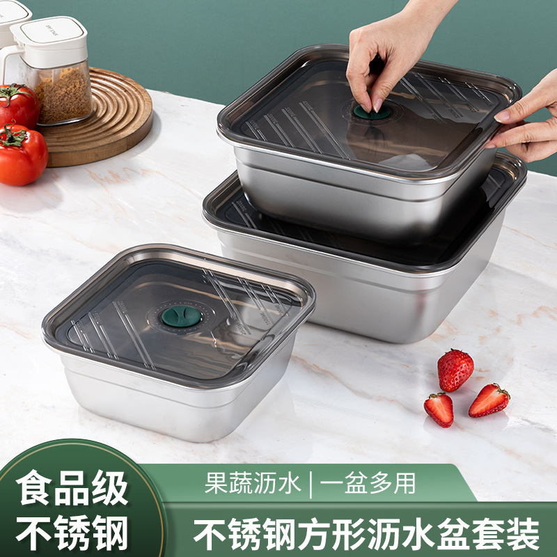 ステンレス鋼 304 スクエア多目的洗面器家庭用排水バスケット蓋付き鮮度保持ボックスセット業務用洗面器平底スクエア洗面器